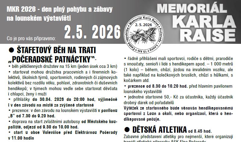 Dne 2. května 2026 se v Lounech uskuteční další ročník Memoriálu Karla Raise, tradiční sportovní akce pořádané na počest významné osobnosti místního sportu. Memoriál je každoročně příležitostí pro setkání sportovců, fanoušků i široké veřejnosti a nabízí nejen kvalitní sportovní výkony, ale i přátelskou atmosféru a podporu komunitního života v regionu.